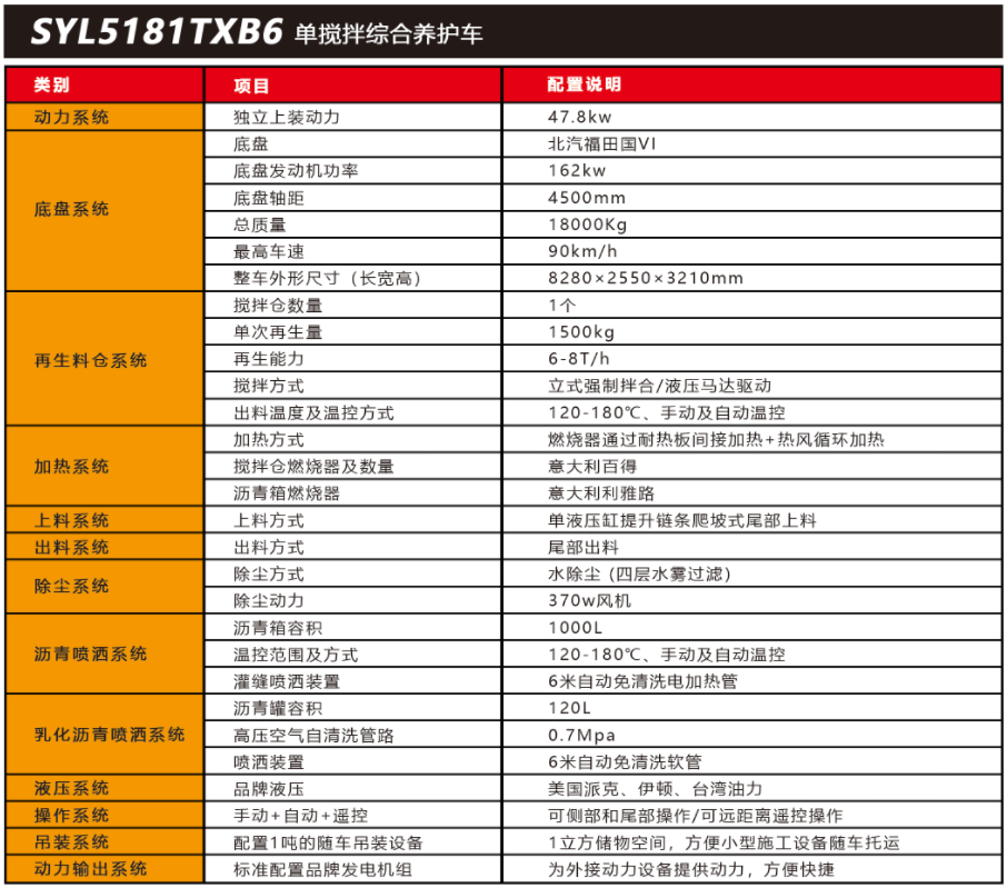 SYL5181TXB6 單攪拌綜合養(yǎng)護(hù)車(chē)是一款集現(xiàn)場(chǎng)生產(chǎn)新瀝青混合料、瀝青路面冷料、 舊料、銑刨料100%現(xiàn)場(chǎng)加熱再生利用 ,熱瀝青灑布、裂紋跟蹤灌縫、乳化瀝青噴灑、為其他裝置提供電力和液壓動(dòng)力等多種功能于一體的瀝青路面熱再生綜合養(yǎng)護(hù)車(chē)??蓪?shí)現(xiàn)多場(chǎng)合、多路面的各種類(lèi)養(yǎng)護(hù)作業(yè) ,養(yǎng)護(hù)修補(bǔ)費(fèi)用低 ,作業(yè)快捷 ,高效率、節(jié)能環(huán)保性能突出等特點(diǎn)。適用于遠(yuǎn)郊較寬闊區(qū)域中大施工量和高速公路的修補(bǔ)施工。
